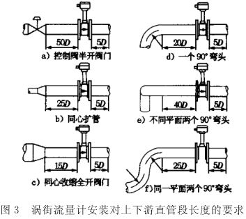 b)渦街流量計(jì)對(duì)安裝點(diǎn)上下游直管段的*小長(zhǎng)度要求根據(jù)現(xiàn)場(chǎng)情況各不相同,如圖3所示。