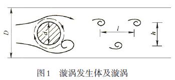 渦街流量計屬于速度式流量計,是由漩渦發(fā)生體和頻率檢測器構成的變送器、信號轉換器等環(huán)節(jié)組成。其測量原理是在流動的流體中,若垂直流動方向放置一個漩渦發(fā)生體,在某一雷諾數(shù)范圍內,將在漩渦發(fā)生體的后面的兩側交替產(chǎn)生有規(guī)律的漩渦(見圖1),旋渦列在旋渦發(fā)生體下游非對稱地排列。