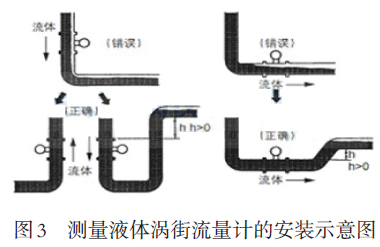 測量液體時為保證測量精確,渦街流量計的管道必須充滿液體。渦街流量計安裝在水平管道上時,應將下游段的管道高于渦街流量計,以保持滿管;當流體向下流動時,應將下游段的管道高于渦街流量計,以保持滿管。流量計安裝在垂直管道上時,流體應該向上流動,當流體向下流動時,應將下游段的管道高于渦街流量計,以保持滿管,如圖3所示。