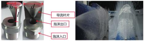 圖 1 為電弧風扇噴嘴的結構和噴霧,一種新型的噴嘴主要由一個蒸汽流量計入口、出口和導流葉片組成。出流口的圓柱形設計降低了湍流強度。導流葉片類似于流線型尾部,產生類似于弧形風扇形狀的蒸汽流量計噴霧,其形狀類似于掘進機的粉塵源。