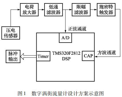 本文設(shè)計(jì)的基于 TMS320F2812 DSP 的數(shù)字飽和蒸汽計(jì)量表的信號處理系統(tǒng)由前置放大電路和數(shù)字信號處理電路兩部分組成。本文選用的前置放大電路即為目前被廣泛應(yīng)用的普通飽和蒸汽計(jì)量表的前置放大電路,主要由電荷放大電路、低通濾波電路、限幅濾波電路和施密特觸發(fā)電路組成; 對于經(jīng)壓電傳感器測得的渦街信號采用了頻域分析和時(shí)域分析相結(jié)合的方式,即由前置放大電路和數(shù)字信號處理電路相配合。時(shí)域分析通道利用 DSP 事件管理器的捕獲模塊,對前置放大電路輸出的方波進(jìn)行頻率計(jì)算,然后再由 DSP 事件管理器通用定時(shí)器的比較輸出模塊進(jìn)行脈沖輸出。頻域分析通道即 DSP對低通濾波電路輸出的疊加了許多噪聲的正弦信號進(jìn)行 A/D 采樣,再利用 DSP 對 A/D 采樣的結(jié)果進(jìn)行頻譜分析,從而得出此時(shí)渦街信號的頻率,*后由 DSP 通用定時(shí)器的比較輸出模塊進(jìn)行脈沖輸出。系統(tǒng)設(shè)計(jì)方案示意圖如圖 1 所示。