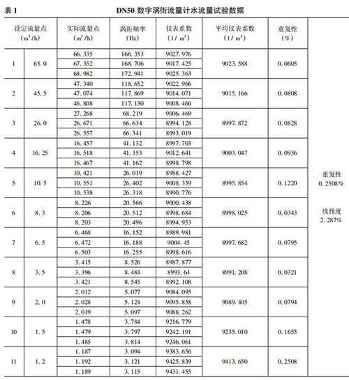 將本文實(shí)現(xiàn)的數(shù)字飽和蒸汽計(jì)量表在上述 50mm 口 徑( 簡稱 DN50) 的水流量試驗(yàn)裝置上進(jìn)行試驗(yàn)。先在其正常流量范圍內(nèi)進(jìn)行試驗(yàn),流量從大到小逐漸降低,之后不斷探求其所能測量的*小流量。每個(gè)流量點(diǎn)試驗(yàn)三次,計(jì)算其重復(fù)性、平均儀表系數(shù)和線性度。水流量試驗(yàn)數(shù)據(jù)如表 1 所示。