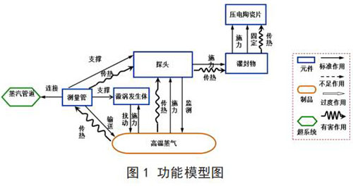建立已有系統(tǒng)的功能模型(見圖 1)。通過功能模型分析,描述了系統(tǒng)元件及其之間的相互關(guān)系,并得出導(dǎo)致傳感器耐受溫度不足問題的功能因素:高溫蒸氣對測量管傳熱;測量管對探頭傳熱;探頭對灌封物傳熱;灌封物對壓電陶瓷片傳熱;高溫蒸氣對探頭傳熱。