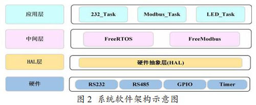 Modbus 通訊模塊的軟件架構(gòu)如圖 2 所示,分為硬件層、硬件抽象層,中間層和應用層。中間層包括一個實時操作系統(tǒng)FreeRTOS 和一個針對嵌入式環(huán)境開發(fā)的輕量級 Modbus 協(xié)議庫Freemodbus。在應用層,主要創(chuàng)建了三個任務,232_Task 負責讀 取和解析流量計表頭輸出的文本信息,Modbus_Task 負責存儲 解析后的流量計數(shù)據(jù)到 Modbus 寄存器表,以及以 Modbus 協(xié)議與取水監(jiān)測設(shè)備通信,LED_Task 是一個輔助任務,主要用來提示程序運行狀態(tài)。