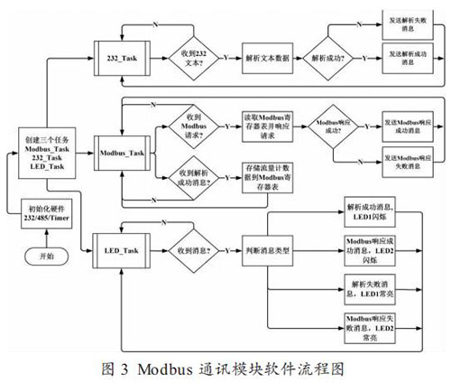 圖 3 為 Modbus 通訊模塊的軟件流程圖,創(chuàng)建的三個任務都是以 FreeRTOS 系統(tǒng)的消息(Message)來驅(qū)動。