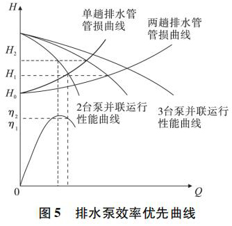 當(dāng)執(zhí)行多臺排水泵同時運行時,通過排水泵特性曲線與管路特性曲線的比較,選擇非常好的匹配排水泵與排水管數(shù)量,保證排水泵在非常好的新效率點運行。如圖 5 所示。