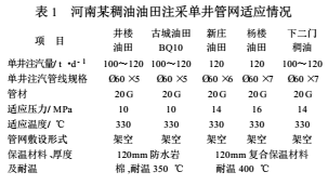 主要對(duì)河南油田某稠油注汽流程和單井注汽管網(wǎng)現(xiàn)狀進(jìn)行調(diào)查,進(jìn)而做出適應(yīng)性分析與評(píng)價(jià)。井樓零區(qū)、一二區(qū)、三區(qū)、七區(qū)(除七區(qū)南部),古城B125、BQ10區(qū),新莊與楊樓油田都采用計(jì)量站單井配汽流程;井樓油田七區(qū)南部、GQ3區(qū),古城油田B125區(qū)及楊樓油田BQ26區(qū)注汽采用串糖糊蘆流程。河南稠油油田單井注汽管網(wǎng)適應(yīng)情況見表1。