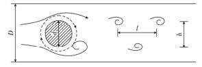 智能蒸汽流量計是由漩渦發(fā)生體、頻率檢測器和信號轉(zhuǎn)換器等環(huán)節(jié)組成,輸出 4 ~ 20 mADC 信號或脈沖電壓信號。其測量原理是在流動的流體中的垂直流動方向安放 1 根或多根非流體型阻流體,在一定的流量范圍內(nèi),流體在阻流體兩側(cè)交替地分離、釋放出 2 串頻率正比于管道內(nèi)的平均流速、規(guī)則的、不對稱有規(guī)律的交替漩渦列,如圖 1 所示,且兩側(cè)漩渦旋轉(zhuǎn)方向相反 。采用檢測元件測出漩渦頻率就可以推算出流體的流量。