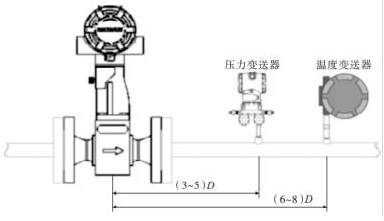 智能蒸汽流量計的口徑如果與工藝管道相同,不能滿足流量儀表要求時,或者在此流速下測量準確度不能保證時,需要縮小儀表口徑,從而提高管內(nèi)流速,保證測量精度。上下游必須有足夠的直管段,若傳感器安裝點的上游在同一平面上有 2 個 90°彎頭時,上游直管段≥25D,下游直管段≥5D。根據(jù)測量的需要,需在智能蒸汽流量計附近測量壓力和溫度時,測壓點應(yīng)在傳感器下游的(3 ~5)D 處,測溫點應(yīng)在傳感器下游的(6 ~8)D 處,如圖 3 所示。