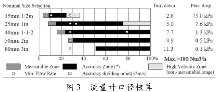 從圖3可見,出流量計(jì)口徑為DN80時(shí),*小流量無法測(cè)量;流量計(jì)口徑縮徑至DN50時(shí),*小流量可測(cè)(此時(shí)流體的雷諾數(shù)非常接近2×104),但此時(shí)的測(cè)量精度稍微差些;流量計(jì)口徑縮徑至DN40時(shí),*小流量可測(cè),且精度也能得到保證。用上述公式計(jì)算的壓損與軟件計(jì)算出來的也基本一致,差別來自計(jì)算時(shí)流速及流量計(jì)口徑均采用的是估算值。如果流量計(jì)縮徑至DN25時(shí),流量計(jì)的壓損已經(jīng)達(dá)到7.6kPa,壓損較大,無法滿足工藝要求。因此選擇DN40口徑的流量計(jì)能滿足要求。對(duì)于DN50口徑的方案,如果流量大于54Nm3/h時(shí),流量計(jì)的精度為此款流量計(jì)的*佳精度,為1.0%,當(dāng)流量為50Nm3/h時(shí),此時(shí)流量可測(cè),只是精度稍差些,約為1.81%,但流量計(jì)的壓損會(huì)小很多,從節(jié)能降耗方面考慮,選擇DN50口徑的流量計(jì)也是可以的。綜上,選擇DN40和DN50口徑的渦街流量計(jì)都能滿足要求。