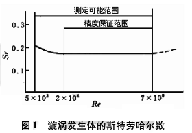 斯特勞哈爾數(shù)(Sr)是通過試驗確定的無因次數(shù)。圖1中表示出了斯特勞哈爾數(shù)(Sr)和雷諾數(shù)(Re)的關(guān)系,曲線的平直部分對應(yīng)渦街流量計正常測量的范圍。只要檢測出頻率f就可以求得管內(nèi)的流速。