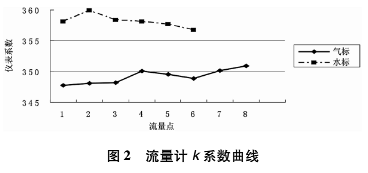2)表1、2分別是流量計在液體流量標準裝置、氣體流量標準裝置上通過實際檢定得到的檢定數(shù)據(jù),兩套裝置各自檢定結(jié)果的儀表線性、重復性均合格。但從兩個裝置檢測數(shù)據(jù)比對分析看來,在合適雷諾數(shù)范圍內(nèi),同樣一臺檢定合格的渦街流量計,在不同介質(zhì)的標準裝置上檢定數(shù)據(jù)相差還是很明顯的,儀表系數(shù)相差2.5%左右,而且k系數(shù)曲線趨勢也并不相同,如圖2所示。