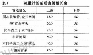2)要求流量計(jì)的前后要有一定的直管段,直管段的長(zhǎng)度應(yīng)符合表1的要求(其中D為管道直徑)。在規(guī)定的直管段長(zhǎng)度內(nèi),管道入流段與出流段目測(cè)應(yīng)是平直的。為保證被測(cè)介質(zhì)滿(mǎn)管,流量計(jì)應(yīng)盡量避免安裝在調(diào)節(jié)閥、半開(kāi)閘閥的下游。一般情況下不在擴(kuò)大管后安裝流量計(jì)。如果流量測(cè)量時(shí)需要進(jìn)行溫度或壓力補(bǔ)償時(shí),取壓點(diǎn)應(yīng)在流量計(jì)前l(fā)D以外,測(cè)溫點(diǎn)應(yīng)在流量計(jì)后5D以外。