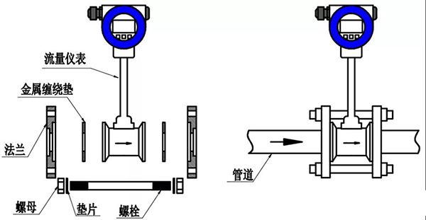 (3)在法蘭的內(nèi)槽內(nèi)裝上與管道通徑相同的密封墊圈,將流量計裝入法蘭中,流量計的流向標應與流體方向相同,然后用螺栓緊固好。