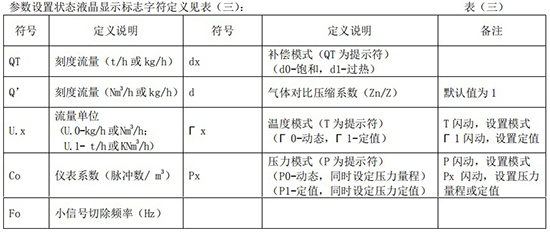 3.1 壓縮空氣流量計(jì)出廠前已將各參數(shù)根據(jù)用戶訂貨要求設(shè)置完畢,用戶無(wú)須設(shè)置。如用戶需要改變量程,請(qǐng)按下述方法設(shè)定。例如,φ 600 插入式流量表,原滿度流量為 50000m3/h,頻率為 694.4Hz。滿度流量現(xiàn)改為 70000m3/h,頻率為 972.2Hz 進(jìn)入每項(xiàng)流量參數(shù)設(shè)置頁(yè)后,其右端標(biāo)志字符均進(jìn)行閃動(dòng)提示,每項(xiàng)參數(shù)設(shè)置完畢后,必須按 SET 鍵確認(rèn)才能寫入存儲(chǔ)。