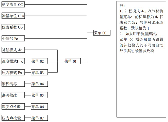 3.1、本版本壓縮空氣流量計表頭操作界面采用菜單形式進行參數(shù)設置,框圖如下: