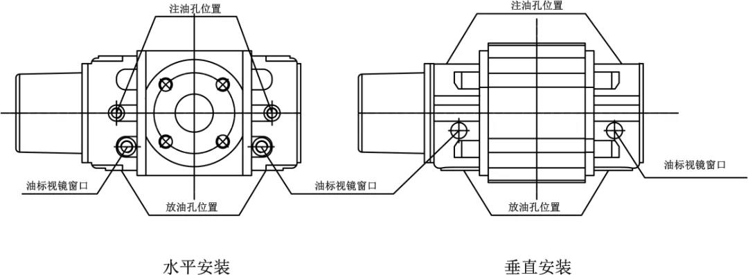 (3)注油孔位于流量計(jì)側(cè)上方,放油孔位于流量計(jì)下方,如圖所示(垂直安裝、水平安裝都如此);