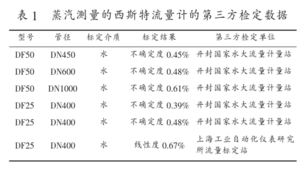 目前,國(guó)內(nèi)*三方標(biāo)定僅有開(kāi)封**水大流量計(jì)量站能標(biāo)定口徑達(dá)1.6m的大管徑蒸汽流量計(jì),可以提供1.6m及以下全口徑檢定**。部分用于蒸汽測(cè)量的西斯特流量計(jì)的*三方檢定數(shù)據(jù)如表1所示。
