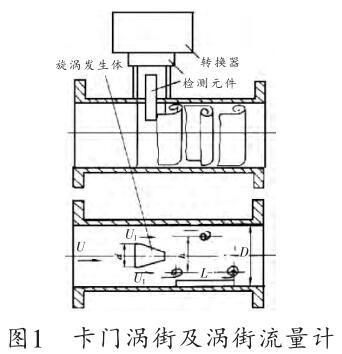 在流體中設(shè)置旋渦發(fā)生體(阻流體),從旋渦發(fā)生體兩側(cè)交替地產(chǎn)生有規(guī)則的旋渦,這種旋渦稱(chēng)為卡門(mén)渦街,如圖1所示。