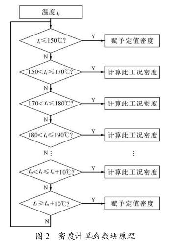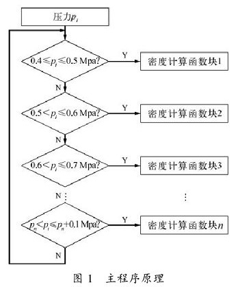 定義密度計(jì)算程序是蒸汽壓力0.4~0.5MPa的一個(gè)函數(shù),以相同的方法定義0.5~0.6MPa,0.6~0.7MPa,一直到0.9~1MPa等若干個(gè)函數(shù),這里不再重復(fù)。通過(guò)對(duì)壓力值范圍的判斷調(diào)用相應(yīng)的函數(shù),就可以得到較為準(zhǔn)確的密度值。程序框圖如圖1,圖2所示,pi為蒸汽壓力,ti為蒸汽溫度。